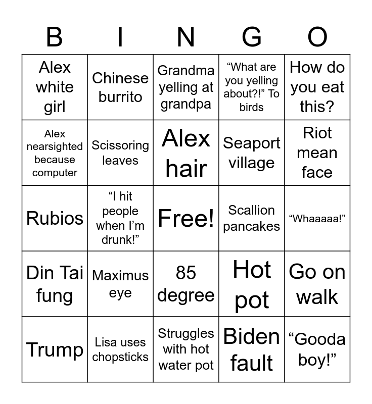 This bingo card has a free space and 24 words: Maximus eye, Lisa uses chopsticks, Alex hair, Trump, How do you eat this?, Alex white girl, Alex nearsighted because computer, Chinese burrito, Scallion pancakes, 85 degree, Seaport village, Rubios, Hot pot, Go on walk, Scissoring leaves, Biden fault, “Whaaaaa!”, Grandma yelling at grandpa, Riot mean face, “I hit people when I’m drunk!”, “Gooda boy!”, Din Tai fung, “What are you yelling about?!” To birds and Struggles with hot water pot.