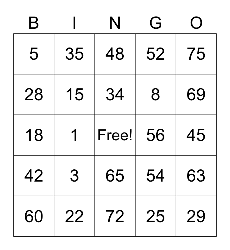 This bingo card has a free space and 24 words: 3, 22, 34, 60, 75, 5, 28, 35, 56, 65, 8, 18, 54, 63, 15, 25, 45, 48, 69, 1, 29, 42, 52 and 72.