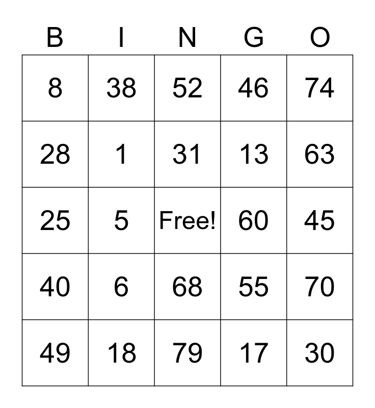 This bingo card has a free space and 24 words: 6, 18, 31, 49, 74, 8, 28, 38, 60, 68, 13, 25, 55, 70, 1, 17, 45, 52, 63, 5, 30, 40, 46 and 79.
