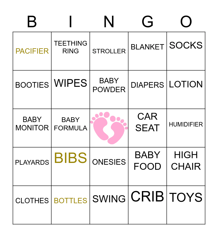 This bingo card has a free space and 24 words: BIBS, BOTTLES, BABY POWDER, CLOTHES, SOCKS, PACIFIER, BOOTIES, TEETHING RING, CAR SEAT, ONESIES, DIAPERS, BABY MONITOR, BABY FOOD, HIGH CHAIR, WIPES, CRIB, HUMIDIFIER, STROLLER, LOTION, BABY FORMULA, TOYS, PLAYARDS, BLANKET and SWING.