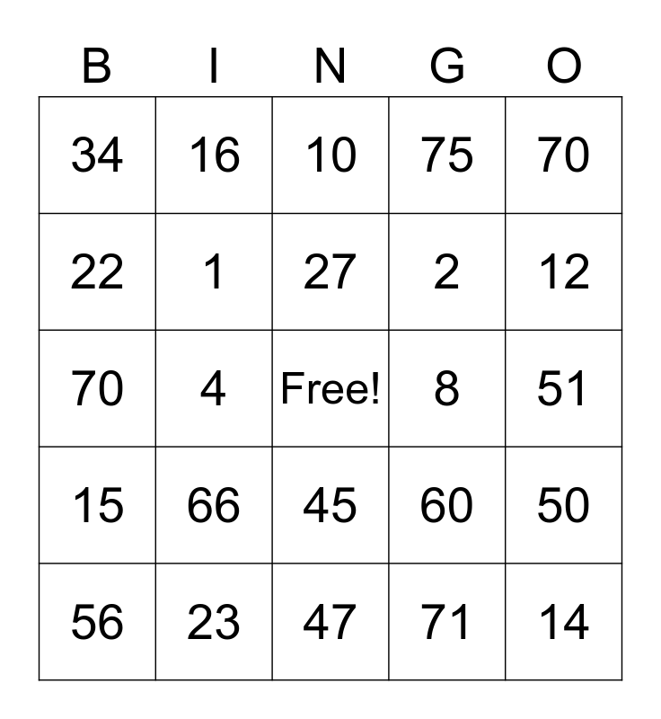 This bingo card has a free space and 24 words: 66, 23, 27, 56, 70, 34, 22, 16, 8, 45, 2, 70, 60, 50, 1, 71, 51, 10, 12, 4, 14, 15, 75 and 47.