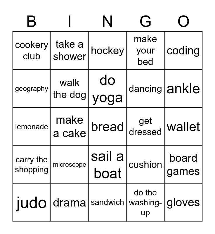 This bingo card has a free space and 24 words: microscope, drama, do yoga, judo, coding, cookery club, geography, take a shower, get dressed, sail a boat, dancing, lemonade, cushion, board games, walk the dog, do the washing-up, wallet, hockey, ankle, make a cake, gloves, carry the shopping, make your bed and sandwich.