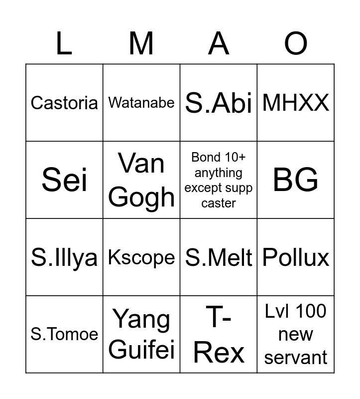 This bingo card has 16 words: Yang Guifei, Pollux, S.Abi, Castoria, S.Illya, Watanabe, S.Melt, T-Rex, Sei, Van Gogh, S.Tomoe, MHXX, Kscope, BG, Bond 10+ anything except supp caster and Lvl 100 new servant.