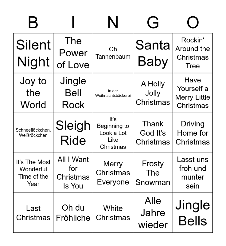 This bingo card has a free space and 39 words: Rudolph The Red-Nosed Reindeer, Feliz Navidad, Santa Claus Is Comin' To Town, Jingle Bell Rock, Last Christmas, Merry Christmas Everyone, In der Weihnachtsbäckerei, Wonderful Christmastime, Rockin' Around the Christmas Tree, It's The Most Wonderful Time of the Year, Sleigh Ride, Santa Baby, Jingle Bells, Driving Home for Christmas, Thank God It's Christmas, All I Want for Christmas Is You, Here Comes Santa Claus, Silent Night, Happy Xmas (War Is Over), Frosty The Snowman, Joy to the World, White Christmas, A Holly Jolly Christmas, Have Yourself a Merry Little Christmas, The Nutcracker Suite, The Little Drummer Boy, Fröhliche Weihnacht überall, O Holy Night, O Come All Ye Faithful, The Power of Love, The First Noel, Kling Glöckchen Kling, Oh Tannenbaum, Oh du Fröhliche, Alle Jahre wieder, Leise rieselt der Schnee, Lasst uns froh und munter sein, Schneeflöckchen, Weißröckchen and Ihr Kinderlein kommet.