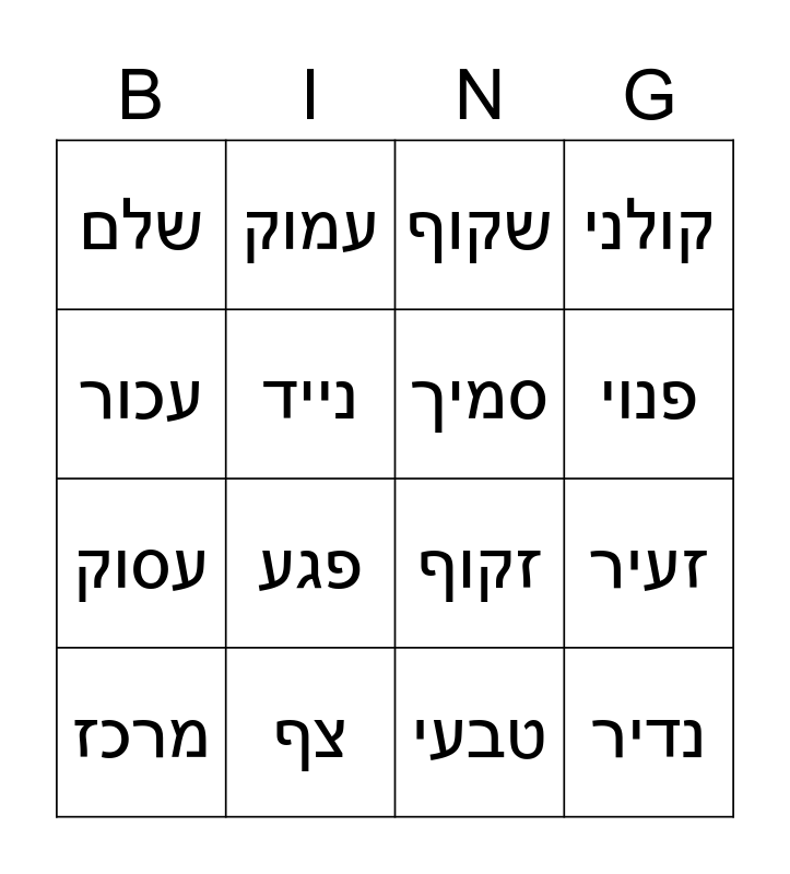 This bingo card has 21 words: צף, מלחמה, עמוק, זרח, טבעי, סמיך, שלם, שקוף, זקוף, פנוי, עסוק, קולני, נדיר, פראי, נייד, בשל, מרכז, פגע, עכור, זעיר and פתוח.