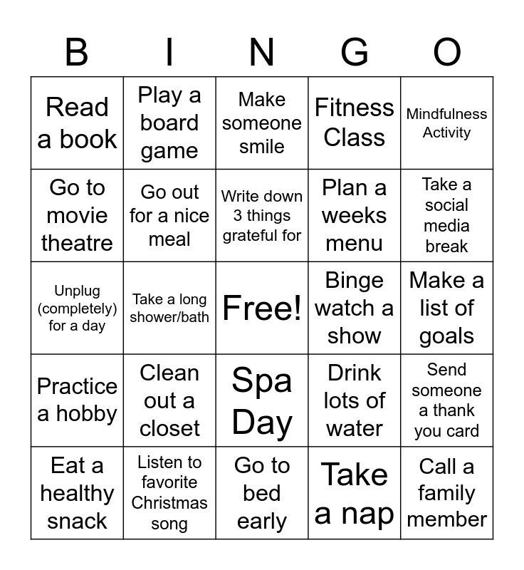 This bingo card has a free space and 35 words: Explore a new city, Make your favorite treat, Decorate your house, Go out for a nice meal, Spa Day, Fitness Class, Go to movie theatre, Get dressed up, Write down 3 things grateful for, Do an act of kindness, Unplug (completely) for a day, Mindfulness Activity, Call a friend, Go to a holiday event, Read a book, Binge watch a show, Take a nap, Take a long shower/bath, Practice a hobby, Call a family member, Drink lots of water, Eat a healthy snack, Send someone a thank you card, Listen to favorite Christmas song, Make someone smile, Take a social media break, Watch a fun, Exercise for 20 min, Plan a weeks menu, Make a list of goals, Go look at lights, Go to bed early, Clean out a closet, Play a board game and Build a puzzle.