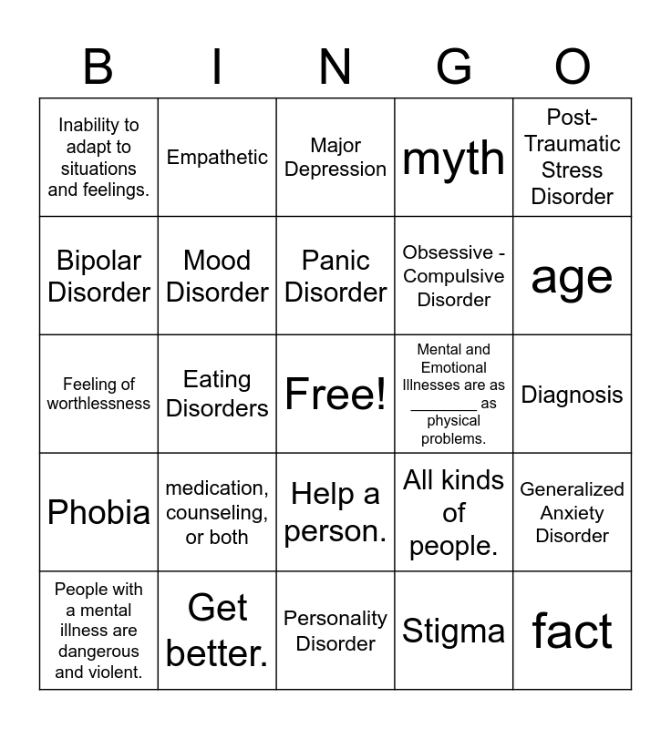 This bingo card has a free space and 24 words: medication, counseling, or both, Get better., Panic Disorder, People with a mental illness are dangerous and violent., Post-Traumatic Stress Disorder, Inability to adapt to situations and feelings., Bipolar Disorder, Empathetic, Mental and Emotional Illnesses are as ________ as physical problems., Help a person., Obsessive -Compulsive Disorder, Feeling of worthlessness, All kinds of people., Generalized Anxiety Disorder, Mood Disorder, Stigma, Diagnosis, Major Depression, age, Eating Disorders, fact, Phobia, myth and Personality Disorder.