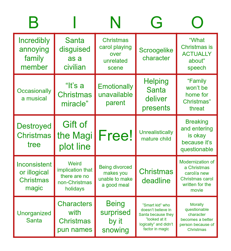 This bingo card has a free space and 41 words: *Minor inconvenience* “CHRISTMAS IS RUINED”, Destroyed Christmas tree, Last minute Christmas preparations, “It’s a Christmas miracle”, Characters with Christmas pun names, Being divorced makes you unable to make a good meal, Emotionally unavailable parent, Jesus play, “What Christmas is ACTUALLY about” speech, Inconsistent or illogical Christmas magic, Gift of the Magi plot line, Scroogelike character, Morally questionable character becomes a better person because of Christmas, Breaking and entering is okay because it’s questionable, Unrealistically mature child, Weird implication that there are no non-Christmas holidays, Very busy on Christmas Eve (parties etc), Incredibly annoying family member, Unreasonably mean older sibling, Christmas carol playing over unrelated scene, Modernization of a Christmas carol/a new Christmas carol written for the movie, Winter activities (ice skating, snow angels, etc.), Being surprised by it snowing, Helping Santa deliver presents, Parents not believing in Santa and not questioning presents appearing on Christmas, Children not believing in Santa despite having undeniable proof he exists, “Smart kid” who doesn’t believe in Santa because they “looked at it logically” and didn’t factor in magic, Green Christmas threat, “Family won’t be home for Christmas” threat, Easily avoidable conflict, Over ambitious elves, Santa disguised as a civilian, Unorganized Santa, Using holly as mistletoe, Christmas deadline, Occasionally a musical, Parent death, Small child sees the magic and everyone around them dismisses them only to be proven wrong, Awful parent, Decorations you’d have to leave up all your because of how much work it would be to take them back down and Wise adult tells children a story.