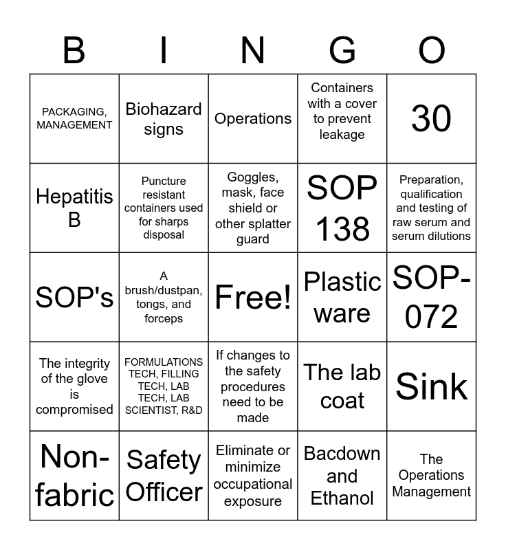This bingo card has a free space and 24 words: FORMULATIONS TECH, FILLING TECH, LAB TECH, LAB SCIENTIST, R&D, Safety Officer, Goggles, mask, face shield or other splatter guard, Non-fabric, 30, PACKAGING, MANAGEMENT, Hepatitis B, Biohazard signs, Plastic ware, If changes to the safety procedures need to be made, SOP 138, SOP's, The lab coat, Sink, Puncture resistant containers used for sharps disposal, Bacdown and Ethanol, SOP-072, Operations, Preparation, qualification and testing of raw serum and serum dilutions, A brush/dustpan, tongs, and forceps, The Operations Management, The integrity of the glove is compromised, Containers with a cover to prevent leakage and Eliminate or minimize occupational exposure.