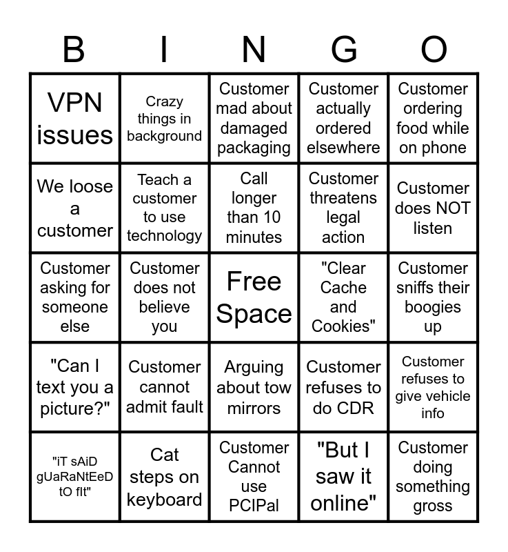 This bingo card has a free space and 79 words: "Are you married?", Customer hits on you, Customer mad about damaged packaging, Customer mentions YouTube videos, "You have a video for it", Tries to return order over a year old, "Is that both?", "Are bulbs included?", Did not get labels, Customer flushes and does not wash hands, Sopmeone calls about applying, Customer asks for something else after finishing call, Customer actually ordered elsewhere, VPN issues, "Just charge the card on file", We loose a customer, Customer is sexist, Customer cannot admit fault, Dead air call, Customer sniffs their boogies up, Customer is eating, Customer ordering food while on phone, Customer asking for someone else, Call longer than 10 minutes, Teach a customer to use technology, Customer hangs up before you answer, Customer talks over you or interrupts, Need more info, Callback DOESN'T answer, Customer needs to confirm with mechanic, Customer does NOT listen, "Can you see my cart?", Customer Cannot use PCIPal, PCIPal will not load, "iT sAiD gUaRaNtEeD tO fIt", "Clear Cache and Cookies", Told to watch your numbers, ManSplaining, Sketchy Customer, Customer doing something gross, Refuses to pay return shipping, "I ordered the right parts", "It's not my fault", Customer calls you a pet name, Multiple customer on call, Crazy things in background, Customer asks you to hold, Escalation, Customer asks for INSANE exception, Contact makes you late for break, Customer refuses to give vehicle info, Customer does not believe you, Customer refuses to do CDR, Customer did NOT read listing, CIT/MAX gets glitchy, "I am a mechanic", Customer says they know what they are talking about but doesn't, Customer is lying, Customer accuses us of being liars or scammers or sketchy, Arguing about tow mirrors, Customer threatens legal action, Customer threatens you, Customer curses you out, "I need to speak to a man", Customer asks for tech/mechanic, Customer asks for more info on part we do not carry, Customer does not understand "NO", SYSTEM DOWN, Customer asks to tell you card number, "Can I text you a picture?", Cat steps on keyboard, Customer hung up, Customer asks for "total with tax", Customer asks for discount, AWESOME CUSTOMER, "But I saw it online", Signify Cancel, Same Day Delivery and Mad about ESTIMATED delivery.