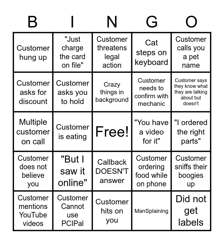 This bingo card has a free space and 79 words: Customer accuses us of being liars or scammers or sketchy, Arguing about tow mirrors, Customer threatens legal action, Customer threatens you, Customer curses you out, "I need to speak to a man", Customer asks for tech/mechanic, Customer asks for more info on part we do not carry, Customer does not understand "NO", SYSTEM DOWN, Customer asks to tell you card number, "Can I text you a picture?", Cat steps on keyboard, Customer hung up, Customer asks for "total with tax", Customer asks for discount, AWESOME CUSTOMER, "But I saw it online", Signify Cancel, "I ordered the right parts", "It's not my fault", Customer calls you a pet name, Multiple customer on call, Crazy things in background, Customer asks you to hold, Escalation, Customer refuses to do CDR, Customer did NOT read listing, CIT/MAX gets glitchy, "I am a mechanic", Customer says they know what they are talking about but doesn't, Customer is lying, Customer hits on you, Customer mad about damaged packaging, Customer mentions YouTube videos, "You have a video for it", Tries to return order over a year old, "Is that both?", "Are bulbs included?", Did not get labels, Customer flushes and does not wash hands, Sopmeone calls about applying, Customer asks for something else after finishing call, Customer actually ordered elsewhere, VPN issues, "Just charge the card on file", We loose a customer, Customer is sexist, Customer cannot admit fault, Dead air call, Customer sniffs their boogies up, Customer is eating, Customer ordering food while on phone, Customer asking for someone else, Call longer than 10 minutes, Teach a customer to use technology, Customer hangs up before you answer, Customer talks over you or interrupts, Need more info, Callback DOESN'T answer, Customer needs to confirm with mechanic, Customer does NOT listen, "Can you see my cart?", Same Day Delivery, Mad about ESTIMATED delivery, "Are you married?", Customer asks for INSANE exception, Contact makes you late for break, Customer refuses to give vehicle info, Customer does not believe you, Customer Cannot use PCIPal, PCIPal will not load, "iT sAiD gUaRaNtEeD tO fIt", "Clear Cache and Cookies", Told to watch your numbers, ManSplaining, Sketchy Customer, Customer doing something gross and Refuses to pay return shipping.