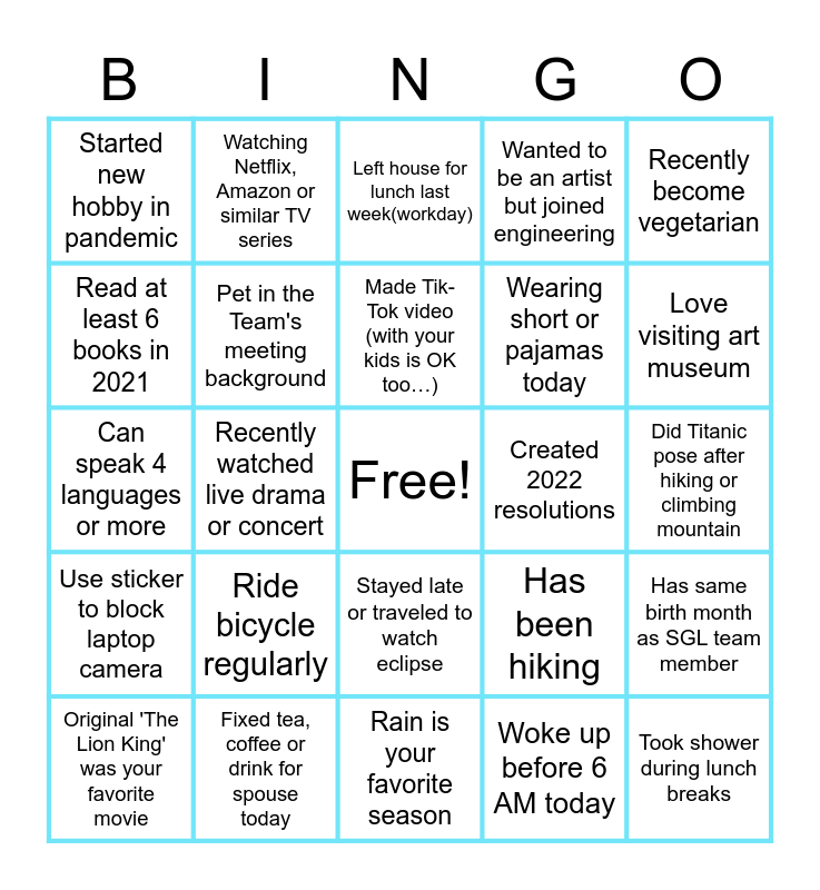 This bingo card has a free space and 27 words: Has been hiking, Eats broccoli not by choice, Wearing short or pajamas today, Rain is your favorite season, Read at least 6 books in 2021, Left house for lunch last week(workday), Watching Netflix, Amazon or similar TV series, Use sticker to block laptop camera, Created 2022 resolutions, Has same birth month as SGL team member, Can speak 4 languages or more, Wanted to be an artist but joined engineering, Original 'The Lion King' was your favorite movie, Fixed tea, coffee or drink for spouse today, Love visiting art museum, Stayed late or traveled to watch eclipse, Pet in the Team's meeting background, Made Tik-Tok video (with your kids is OK too…), Ride bicycle regularly, Started new hobby in pandemic, Did Titanic pose after hiking or climbing mountain, Woke up before 6 AM today, Recently watched live drama or concert, Took shower during lunch breaks, Stayed late or traveled to watch eclipse, Recently become vegetarian and Often sit outside for work.