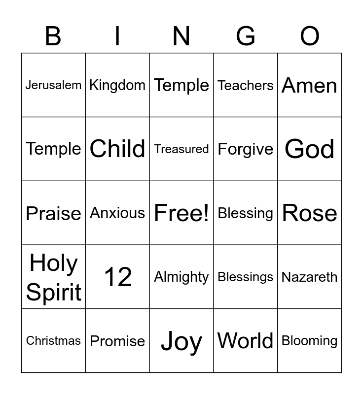 This bingo card has a free space and 29 words: Christmas, Mary, Anxious, Call, Jerusalem, Temple, Child, 12, Blessing, Promise, Rose, Blooming, Joy, World, God, Father, Almighty, Holy Spirit, Amen, Praise, Blessings, Earth, Forgive, Temple, Teachers, Kingdom, Nazareth, Treasured and Heaven.