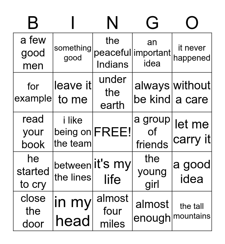 This bingo card has a free space and 24 words: between the lines, in my head, under the earth, close the door, it never happened, a few good men, for example, something good, a group of friends, it's my life, always be kind, read your book, the young girl, a good idea, leave it to me, almost enough, let me carry it, the peaceful Indians, without a care, i like being on the team, the tall mountains, he started to cry, an important idea and almost four miles.