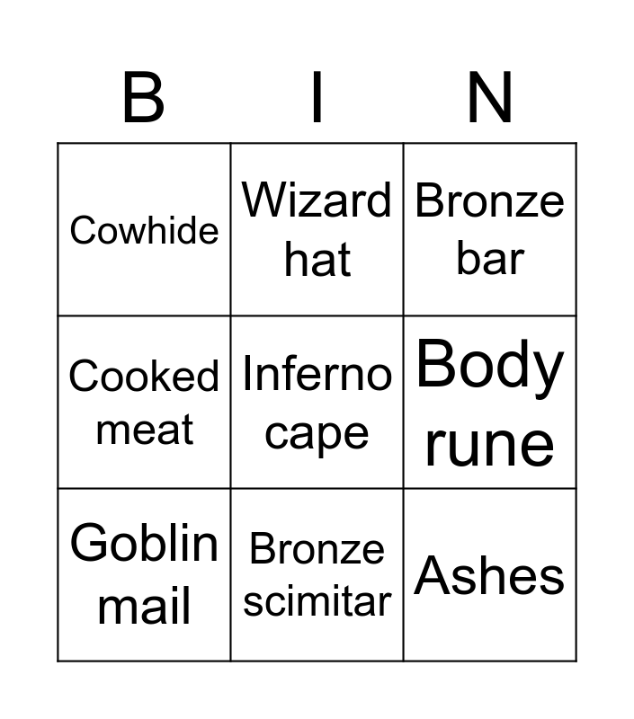 This bingo card has a free space and 8 words: Body rune, Bronze bar, Wizard hat, Goblin mail, Cowhide, Ashes, Cooked meat and Bronze scimitar.