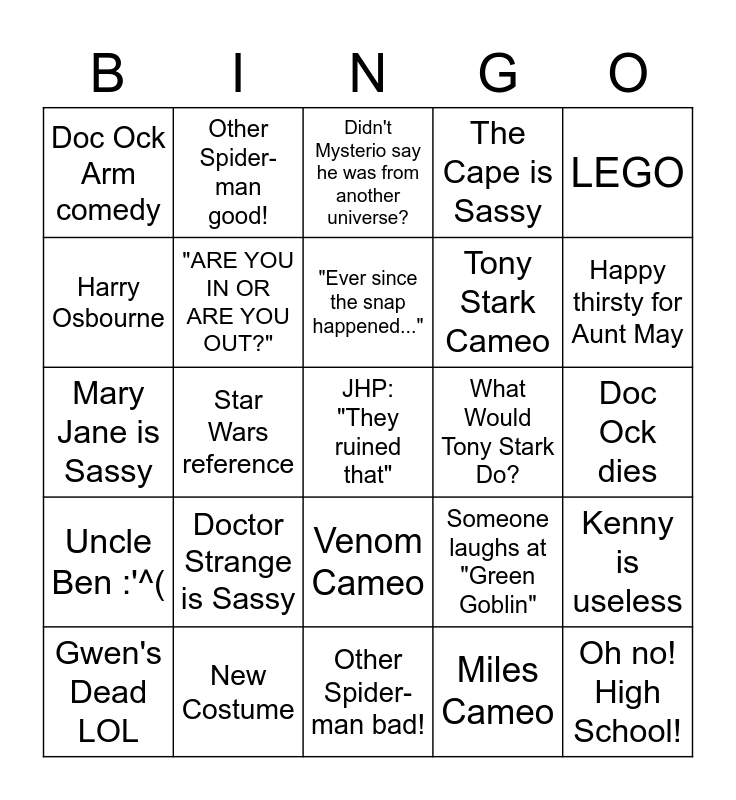 This bingo card has a free space and 24 words: Doctor Strange is Sassy, New Costume, "Ever since the snap happened...", Gwen's Dead LOL, LEGO, Doc Ock Arm comedy, Harry Osbourne, Other Spider-man good!, What Would Tony Stark Do?, Venom Cameo, Tony Stark Cameo, Mary Jane is Sassy, Someone laughs at "Green Goblin", Kenny is useless, "ARE YOU IN OR ARE YOU OUT?", Miles Cameo, Doc Ock dies, Didn't Mysterio say he was from another universe?, Happy thirsty for Aunt May, Star Wars reference, Oh no! High School!, Uncle Ben :'^(, The Cape is Sassy and Other Spider-man bad!.