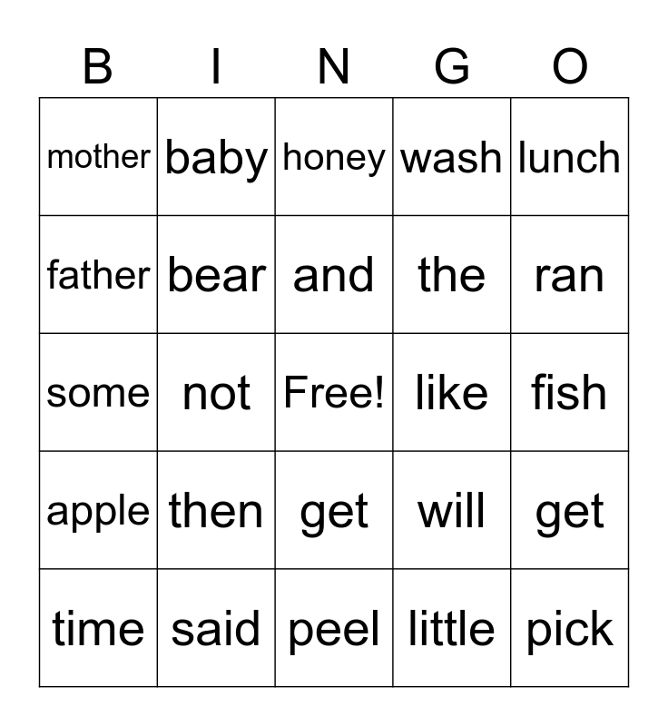 This bingo card has a free space and 24 words: then, said, and, time, lunch, mother, father, baby, like, get, the, some, will, get, bear, little, fish, honey, ran, not, pick, apple, wash and peel.