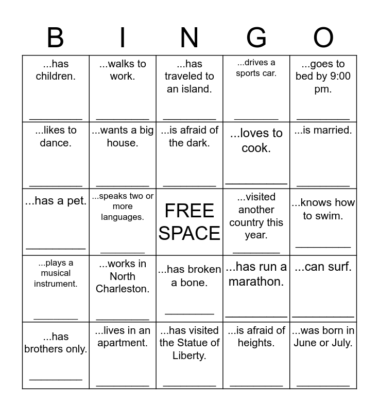 This bingo card has a free space and 24 words: ...works in North Charleston. _________, ...lives in an apartment. _________, ...is afraid of the dark. _________, ...has brothers only. _________, ...goes to bed by 9:00 pm. _________, ...has children. _________, ...likes to dance. _________, ...walks to work. _________, ...visited another country this year. ________, ...has broken a bone. ________, ...loves to cook. _________, ...has a pet. _________, ...has run a marathon. _________, ...can surf. _________, ...wants a big house. _________, ...is afraid of heights. _________, ...knows how to swim. _________, ...has traveled to an island. _________, ...is married. _________, ...speaks two or more languages. _________, ...was born in June or July. _________, ...plays a musical instrument. _________, ...drives a sports car. _________ and ...has visited the Statue of Liberty. _________.