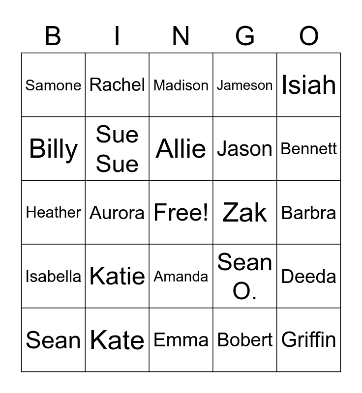 This bingo card has a free space and 24 words: Katie, Kate, Allie, Sean, Isiah, Samone, Billy, Rachel, Zak, Amanda, Jason, Heather, Sean O., Deeda, Sue Sue, Bobert, Barbra, Madison, Bennett, Aurora, Griffin, Isabella, Jameson and Emma.