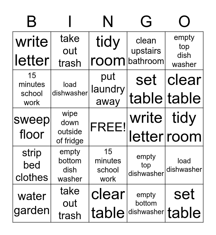 This bingo card has a free space and 24 words: empty bottom dish washer, take out trash, put laundry away, water garden, empty top dish washer, write letter, 15 minutes school work, take out trash, write letter, 15 minutes school work, set table, sweep floor, empty top dishwasher, load dishwasher, load dishwasher, empty bottom dishwasher, tidy room, tidy room, clear table, wipe down outside of fridge, set table, strip bed clothes, clean upstairs bathroom and clear table.