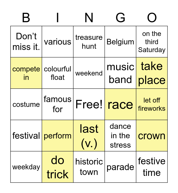 This bingo card has a free space and 24 words: perform, do trick, weekend, weekday, on the third Saturday, Don’t miss it., compete in, various, race, last (v.), music band, costume, dance in the stress, crown, colourful float, parade, let off fireworks, treasure hunt, take place, famous for, festive time, festival, Belgium and historic town.