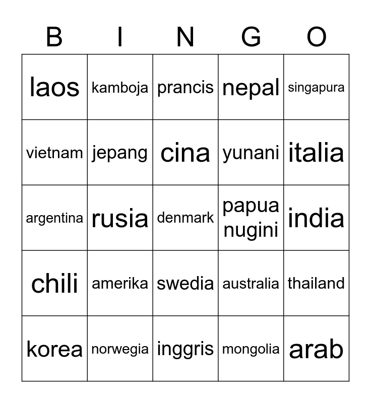 This bingo card has 25 words: amerika, inggris, cina, korea, singapura, laos, vietnam, kamboja, papua nugini, swedia, yunani, argentina, australia, thailand, jepang, arab, india, prancis, italia, rusia, denmark, norwegia, chili, nepal and mongolia.