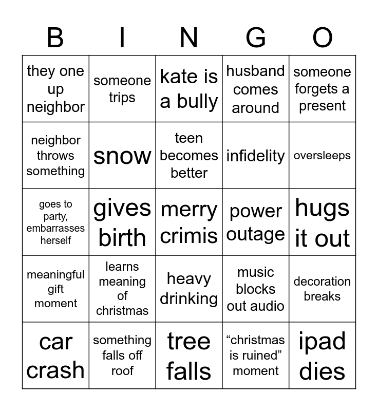 This bingo card has a free space and 24 words: learns meaning of christmas, something falls off roof, teen becomes better, car crash, someone forgets a present, they one up neighbor, neighbor throws something, someone trips, power outage, heavy drinking, infidelity, goes to party, embarrasses herself, music blocks out audio, decoration breaks, snow, “christmas is ruined” moment, hugs it out, kate is a bully, oversleeps, gives birth, ipad dies, meaningful gift moment, husband comes around and tree falls.