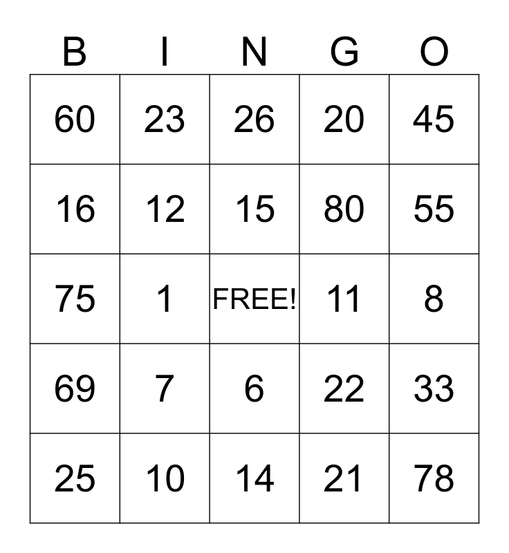 This bingo card has a free space and 24 words: 7, 10, 15, 25, 45, 60, 16, 23, 11, 6, 80, 75, 22, 33, 12, 21, 8, 26, 55, 1, 78, 69, 20 and 14.