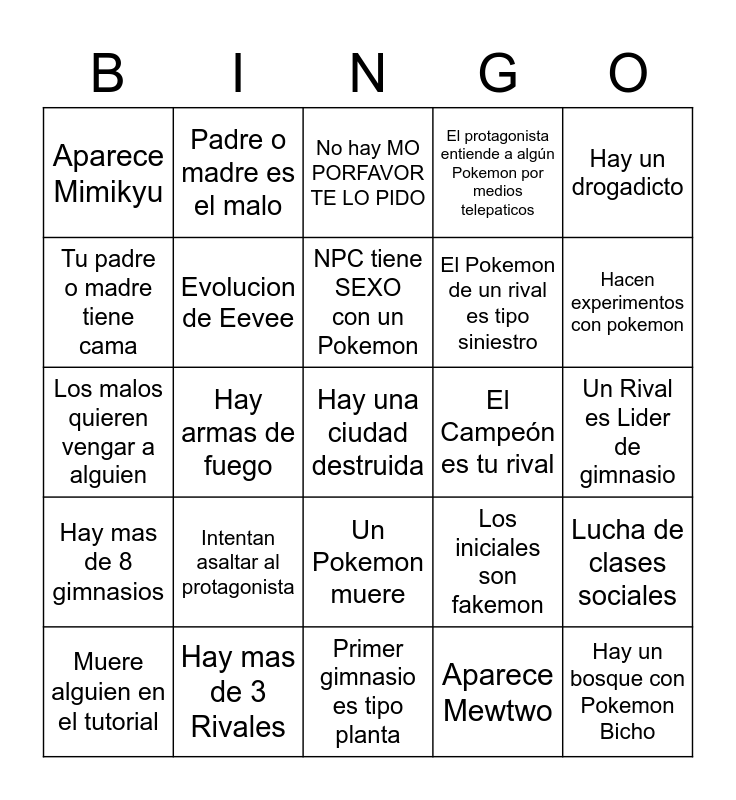 This bingo card has a free space and 24 words: Muere alguien en el tutorial, Intentan asaltar al protagonista, NPC tiene SEXO con un Pokemon, Aparece Mewtwo, Hay un drogadicto, Aparece Mimikyu, Padre o madre es el malo, No hay MO PORFAVOR TE LO PIDO, El Campeón es tu rival, Un Rival es Lider de gimnasio, Los malos quieren vengar a alguien, Evolucion de Eevee, Los iniciales son fakemon, Lucha de clases sociales, Tu padre o madre tiene cama, Hay mas de 3 Rivales, Primer gimnasio es tipo planta, El protagonista entiende a algún Pokemon por medios telepaticos, Hacen experimentos con pokemon, Hay mas de 8 gimnasios, Hay armas de fuego, Un Pokemon muere, El Pokemon de un rival es tipo siniestro and Hay un bosque con Pokemon Bicho.