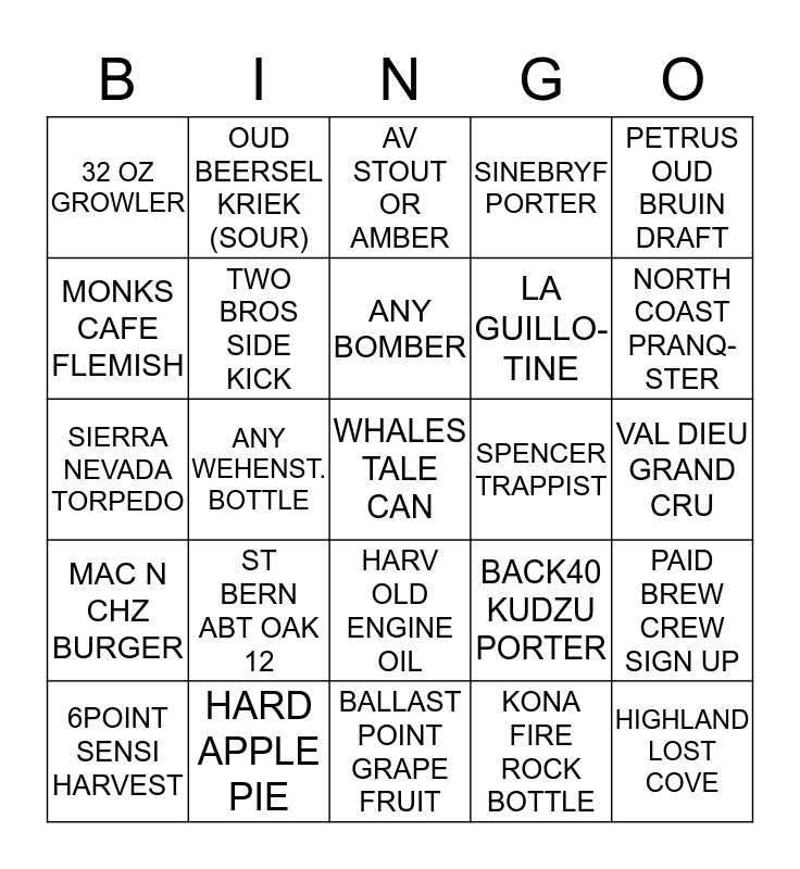 This bingo card has 25 words: ST BERN ABT OAK 12, BALLAST POINT GRAPE FRUIT, ANY BOMBER, 6POINT SENSI HARVEST, PETRUS OUD BRUIN DRAFT, 32 OZ GROWLER, MONKS CAFE FLEMISH, OUD BEERSEL KRIEK (SOUR), SPENCER TRAPPIST, HARV OLD ENGINE OIL, LA GUILLO- TINE, SIERRA NEVADA TORPEDO, BACK40 KUDZU PORTER, PAID BREW CREW SIGN UP, TWO BROS SIDE KICK, HIGHLAND LOST COVE, VAL DIEU GRAND CRU, AV STOUT OR AMBER, NORTH COAST PRANQ-STER, ANY WEHENST. BOTTLE, WHALES TALE CAN, HARD APPLE PIE, MAC N CHZ BURGER, SINEBRYF PORTER and KONA FIRE ROCK BOTTLE.