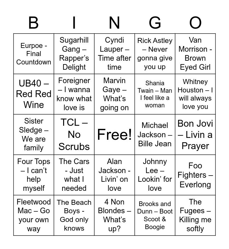 This bingo card has a free space and 25 words: The Cars - Just what I needed, 4 Non Blondes – What’s up?, Marvin Gaye – What’s going on, Fleetwood Mac – Go your own way, Van Morrison - Brown Eyed Girl, Eurpoe - Final Countdown, UB40 – Red Red Wine, Sugarhill Gang – Rapper’s Delight, Michael Jackson – Bille Jean, Alan Jackson - Livin’ on love, Shania Twain – Man I feel like a woman, Sister Sledge – We are family, Johnny Lee – Lookin’ for love, Foo Fighters – Everlong, Foreigner – I wanna know what love is, The Animals - House of the rising sun, Bon Jovi – Livin a Prayer, Cyndi Lauper – Time after time, Whitney Houston – I will always love you, TCL – No Scrubs, The Fugees – Killing me softly, The Beach Boys - God only knows, Four Tops – I can’t help myself, Rick Astley – Never gonna give you up and Brooks and Dunn – Boot Scoot & Boogie.