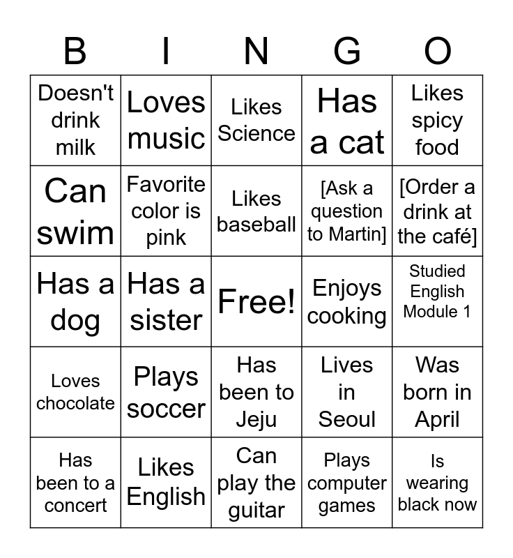 This bingo card has a free space and 24 words: Plays soccer, Likes English, Likes baseball, Has been to a concert, Likes spicy food, Doesn't drink milk, Can swim, Loves music, Enjoys cooking, Has been to Jeju, [Ask a question to Martin], Has a dog, Lives in Seoul, Was born in April, Favorite color is pink, Plays computer games, Studied English Module 1, Likes Science, [Order a drink at the café], Has a sister, Is wearing black now, Loves chocolate, Has a cat and Can play the guitar.
