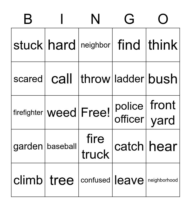 This bingo card has a free space and 24 words: baseball, tree, throw, climb, think, stuck, scared, hard, police officer, fire truck, ladder, firefighter, catch, hear, call, leave, front yard, neighbor, bush, weed, neighborhood, garden, find and confused.