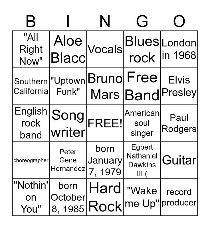 This bingo card has a free space and 24 words: Peter Gene Hernandez, born October 8, 1985, Bruno Mars, "Nothin' on You", London in 1968, "All Right Now", Southern California, Aloe Blacc, American soul singer, born January 7, 1979, Free Band, English rock band, Egbert Nathaniel Dawkins III (, Guitar, "Uptown Funk", "Wake me Up", Paul Rodgers, Vocals, Elvis Presley, Song writer, record producer, choreographer, Blues rock and Hard Rock.
