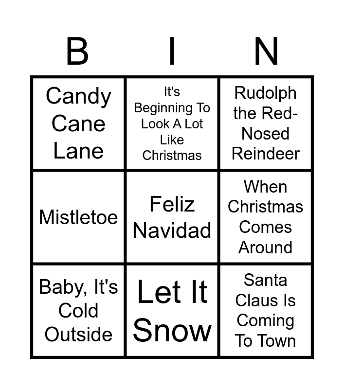 This bingo card has 17 words: Santa Tell Me, The Season's Upon Us, Rudolph the Red-Nosed Reindeer, Candy Cane Lane, Jingle Bell Rock, Mistletoe, Auld Lang Syne, Baby, It's Cold Outside, Let It Snow, When Christmas Comes Around, What Christmas Means to Me, I Want A Hippopotamus For Christmas, Feliz Navidad, It's Beginning To Look A Lot Like Christmas, Santa Claus Is Coming To Town, Merry Christmas and Merry Christmas Everyone.