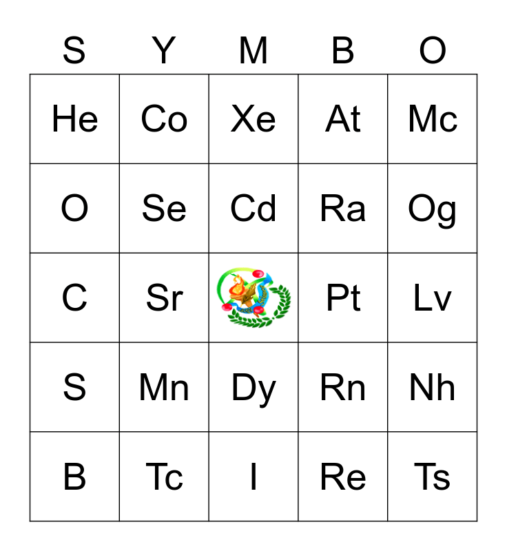 This bingo card has a free space and 24 words: B, Mn, Cd, Re, Mc, He, Co, Xe, Pt, Lv, C, Se, Rn, Nh, O, Tc, I, At, Og, S, Sr, Dy, Ra and Ts.