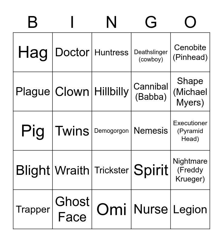 This bingo card has a free space and 25 words: Trapper, Wraith, Hillbilly, Nurse, Shape (Michael Myers), Hag, Doctor, Huntress, Cannibal (Babba), Nightmare (Freddy Krueger), Pig, Clown, Spirit, Legion, Plague, Ghost Face, Omi, Deathslinger (cowboy), Executioner (Pyramid Head), Blight, Twins, Trickster, Nemesis, Cenobite (Pinhead) and Artist (Crow Lady).