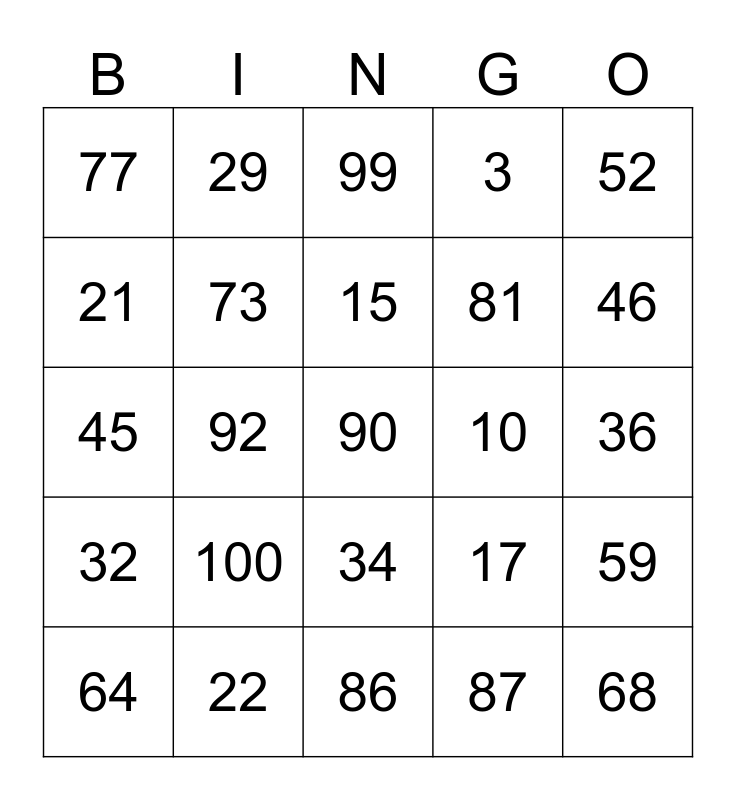 This bingo card has a free space and 24 words: 100, 22, 15, 64, 52, 77, 21, 29, 10, 34, 81, 45, 17, 59, 73, 87, 36, 99, 46, 92, 68, 32, 3 and 86.