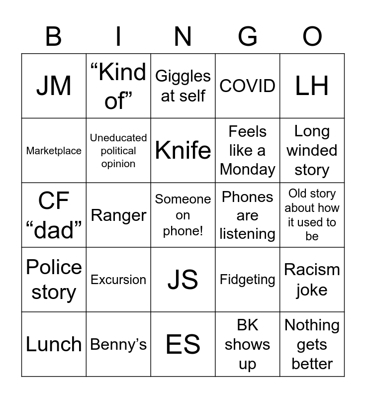 This bingo card has a free space and 24 words: Excursion, Benny’s, Knife, Lunch, LH, JM, Marketplace, “Kind of”, Phones are listening, JS, Feels like a Monday, CF “dad”, Fidgeting, Racism joke, Uneducated political opinion, BK shows up, Old story about how it used to be, Giggles at self, Long winded story, Ranger, Nothing gets better, Police story, COVID and ES.