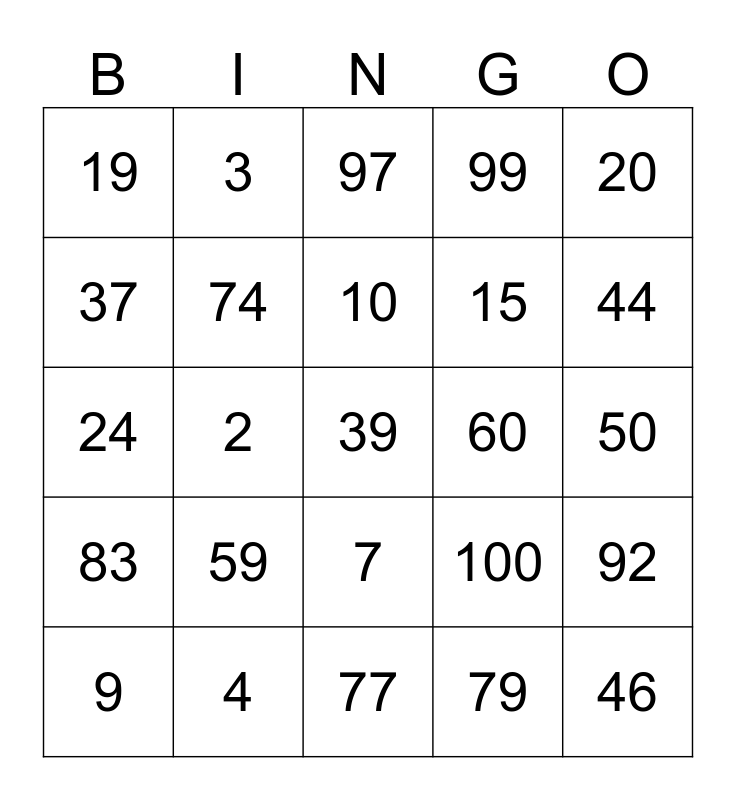This bingo card has 25 words: 59, 77, 10, 9, 20, 19, 37, 3, 60, 7, 15, 24, 100, 92, 74, 46, 50, 97, 44, 2, 39, 4, 83, 99 and 79.