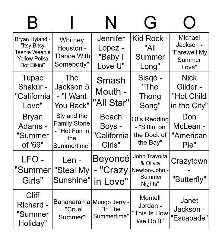 This bingo card has 45 words: Will Smith & DJ Jazzy Jeff - "Summertime", Beach Boys - "California Girls", Taylor Swift - "You Belong with Me", Cliff Richard - "Summer Holiday", Carly Rae Jepsen - "Call Me Maybe", Montell Jordan - "This Is How We Do It", Jennifer Lopez - "Baby I Love U", The Drifters - "Under the Boardwalk", Michael Jackson - "Farewell My Summer Love", Bananarama - "Cruel Summer", Kid Rock - "All Summer Long", Otis Redding - "Sittin' on the Dock of the Bay", Beyoncé - "Crazy in Love", Len - "Steal My Sunshine", Alice Cooper - "School's Out for Summer", Mungo Jerry - "In The Summertime", Robin Thicke - "Blurred Lines", Bryan Adams - "Summer of '69", Fat Joe Featuring Ashanti - "What's Luv?", Nick Gilder - "Hot Child in the City", Whitney Houston - "Dance With Somebody", Katy Perry Featuring Snoop Dogg - "California Gurls", Martha and the Vandellas - "Dancing in the Street", Bryan Hyland - "Itsy Bitsy Teenie Weenie Yellow Polka Dot Bikini", Sugarhill Gang " Rapper's Delight", Don McLean - "American Pie", Fairground Attraction - "Perfect", Don Henley - "The Boys Of Summer", John Travolta & Olivia Newton-John - "Summer Nights", LFO - "Summer Girls", Jason Derulo - "Ridin' Solo", Crazytown - "Butterfly", N Sync - "Tearin' Up My Heart", OMI - "Cheerleader", Justin Timberlake - "LoveStoned", Sly and the Family Stone - "Hot Fun in the Summertime", Miley Cyrus - "Party in the USA", Marky Mark and The Funky Bunch - "Good Vibrations", Janet Jackson - "Escapade", Smash Mouth - "All Star", Tupac Shakur - "California Love", Sisqó - "The Thong Song", Mariah Carey - "Always Be My Baby", The Jackson 5 - "I Want You Back" and Guns N' Roses - "Paradise City".