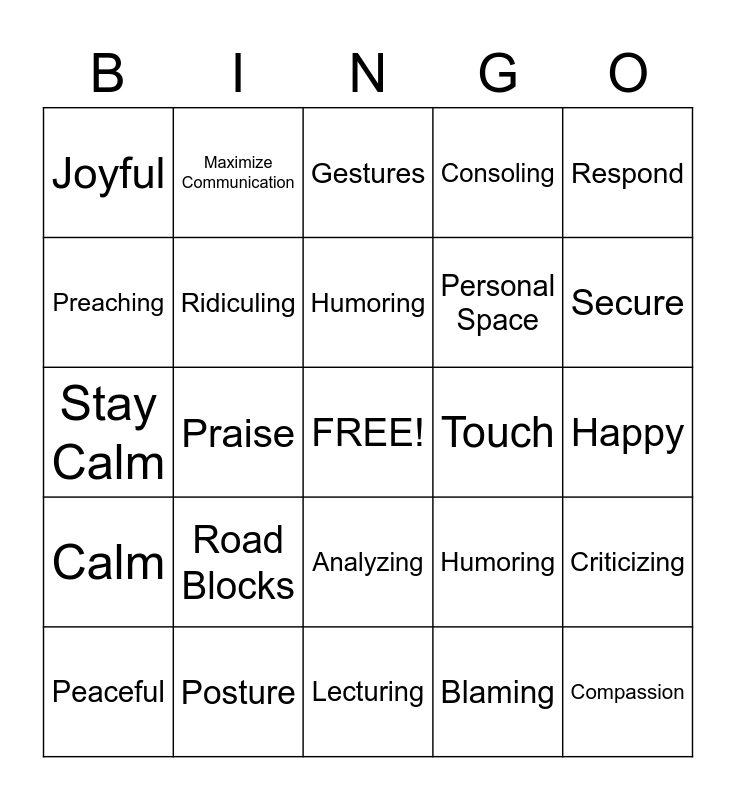 This bingo card has a free space and 24 words: Road Blocks, Posture, Humoring, Peaceful, Respond, Joyful, Preaching, Maximize Communication, Touch, Analyzing, Personal Space, Stay Calm, Humoring, Criticizing, Ridiculing, Blaming, Happy, Gestures, Secure, Praise, Compassion, Calm, Consoling and Lecturing.