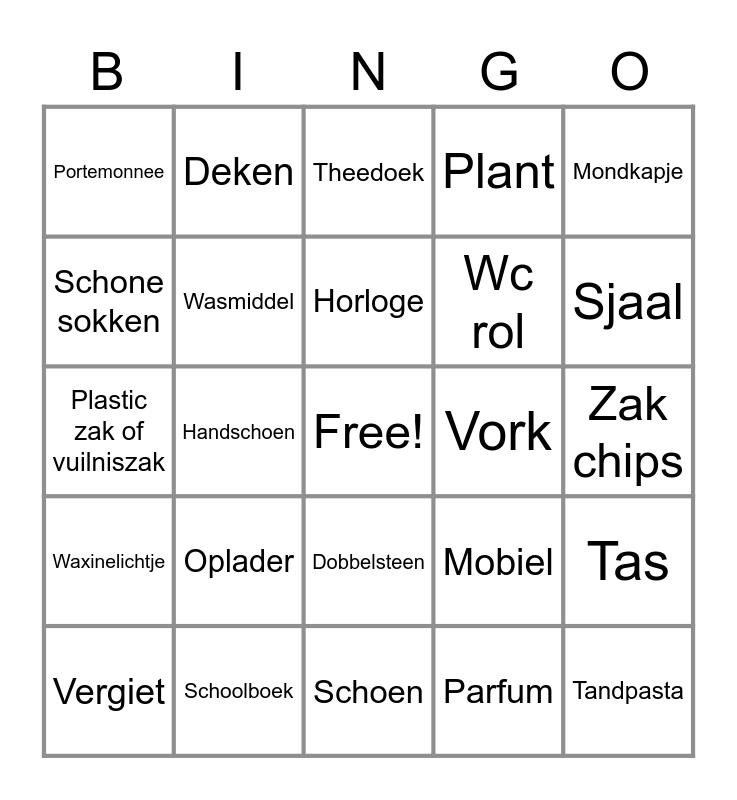 This bingo card has a free space and 54 words: Thee zakje, Waxinelichtje, Kerstbal, Afstandsbediening, Dobbelsteen, Ruiten 7 van een speelkaart, Plant, Frisdrank fles, Schone sokken, Schone onderbroek, Portemonnee, Sleutelbos, Schoolboek, Vergiet, Bieropener, Schoen, Tandpasta, Wc rol, Pak koekjes, Zak chips, Mobiel, Onderzetter, Vork, Mondkapje, Postzegel, Deken, Computertoetsenbord, Theepot / waterkoker, Borstel of kam, Parfum, Snoepje, Shampoo, Speelgoed, Steelpan, Theedoek, Stuk fruit of groente, Plastic zak of vuilniszak, Tas, Flesje bier, Wasmiddel, Aansteker of Lucifer, Puzzelstukje, Munt geld, Sticker, Oplader, Handzeep, Zakdoek, Paraplu, Horloge, Handschoen, Sjaal, Zoutpotje, Snijplank and Stoffer en blik.