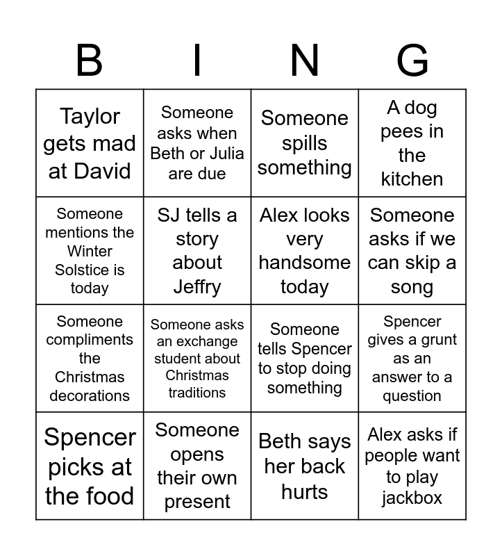 This bingo card has 72 words: Someone talks about Spider-man No Way Home, Someone asks when Beth or Julia are due, Spencer gives a grunt as an answer to a question, Someone who brought food also eats pizza or bread, Spencer says it's time to open presents, Olivia speaks Swedish, A dog pees in the kitchen, A baby cries, Someone compliments the Christmas decorations, Someone accuses someone else of having Covid, Someone says the word Omicron, Someone jokes about Mom or Dad crashing the party, Someone asks an exchange student about Christmas traditions, Taylor gets mad at David, Tachi snaps at Julia, Someone tells Spencer to stop doing something, Someone quotes the Office, Someone mentions the Winter Solstice is today, Someone mentions the movie Elf, Beth says her back hurts, Spencer thinks his wife is coming, Spencer picks at the food, Someone opens the fan, Someone tries to convince someone to steal their gift, Jonah speaks Spanish, Daniella speaks Spanish, Adam speaks Spanish, Someone mentions Josie's blue hair, David brags about how long his school break is, Someone asks Alex how long he has left in school, Jackson talks about anime or a cartoon, Kara says she is "obsessed" with something, Tachi goes and vapes somewhere, Tachi is in the bathroom for more than 5 minutes, Julia uses sarcasm, Russ tells a fun fact about Michigan, Jade laughs or yells the loudest, Spencer tries to go home early, SJ tells a story about Jeffry, Adam tells a story about Graham, Taylor snaps at David, David talks about how much he loves something, Jackson complains about Little Caesars, Kara talks about Disneyland, Beth talks about the baby kicking, Alex asks if people want to play jackbox, Dylan hits someone, Dylan opens the fridge, Jonah talks about the Switch, Josie talks about a boy, Olivia holds a dog, Daniella looks confused by an English conversation, Olivia or Daniella can't think of an English word, Someone opens their own present, Spencer tries to get someone to open his present, Jackson talks about DND, Someone spills something, Someone asks if we can skip a song, People try to team up in White Elephant, Someone opens up the fan in White Elephant, Someone complains we didn't get Buca Di Bepo, Someone asks an out of towner when they go home, Someone asks how many dogs Beth has, Spencer tries to try one of each pizza, Someone mentions the Hawkeye show, Spencer tries to spoil Spider-man, Alex looks very handsome today, Someone mentions how much Beth's baby bump is showing, Someone mentions Beth's baby shower, Someone is 20 minutes late, Someone asks for the wifi or a phone charger and Someone farted.