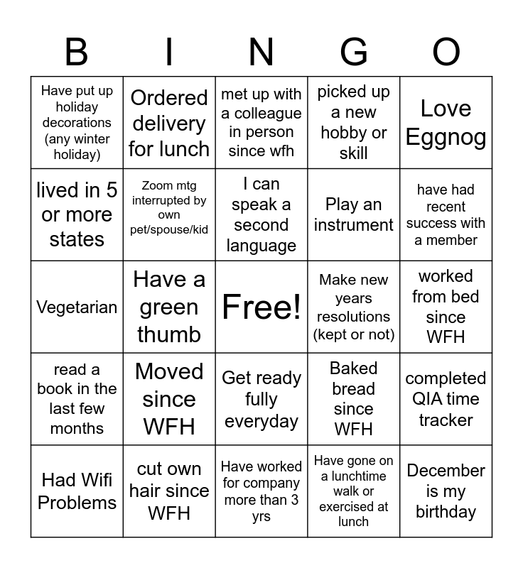 This bingo card has a free space and 24 words: Moved since WFH, cut own hair since WFH, I can speak a second language, Had Wifi Problems, Love Eggnog, Have put up holiday decorations (any winter holiday), lived in 5 or more states, Ordered delivery for lunch, Make new years resolutions (kept or not), Get ready fully everyday, Play an instrument, Vegetarian, Baked bread since WFH, completed QIA time tracker, Zoom mtg interrupted by own pet/spouse/kid, Have gone on a lunchtime walk or exercised at lunch, worked from bed since WFH, met up with a colleague in person since wfh, have had recent success with a member, Have a green thumb, December is my birthday, read a book in the last few months, picked up a new hobby or skill and Have worked for company more than 3 yrs.