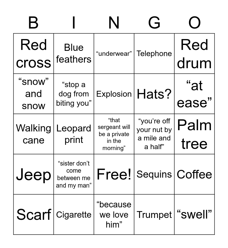 This bingo card has 26 words: Free!, Trumpet, Explosion, Cigarette, Red drum, Red cross, “snow” and snow, Blue feathers, Palm tree, Sequins, Hats?, Walking cane, Coffee, Scarf, Leopard print, Candle, Telephone, Jeep, “underwear”, “that sergeant will be a private in the morning”, “at ease”, “because we love him”, “you’re off your nut by a mile and a half”, “sister don’t come between me and my man”, “stop a dog from biting you” and “swell”.