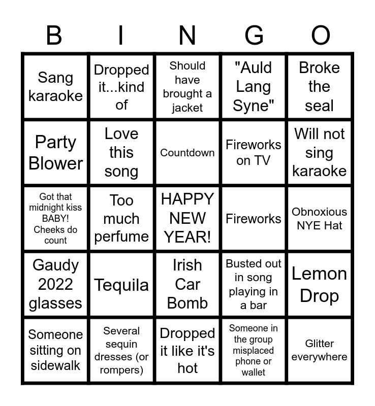 This bingo card has a free space and 24 words: Someone sitting on sidewalk, Tequila, Countdown, Someone in the group misplaced phone or wallet, Broke the seal, Sang karaoke, Dropped it...kind of, Should have brought a jacket, Fireworks, Obnoxious NYE Hat, Got that midnight kiss BABY! Cheeks do count, Love this song, Busted out in song playing in a bar, Lemon Drop, Party Blower, Several sequin dresses (or rompers), Dropped it like it's hot, "Auld Lang Syne", Will not sing karaoke, Gaudy 2022 glasses, Too much perfume, Irish Car Bomb, Fireworks on TV and Glitter everywhere.