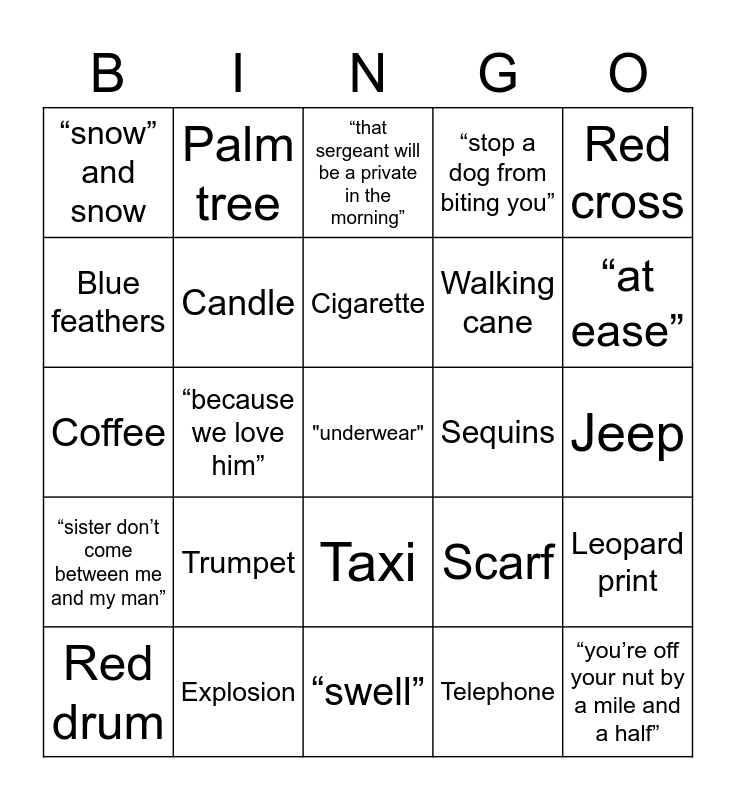 This bingo card has a free space and 24 words: Trumpet, Explosion, Cigarette, Red drum, Red cross, “snow” and snow, Blue feathers, Palm tree, Sequins, Taxi, Walking cane, Coffee, Scarf, Leopard print, Candle, Telephone, Jeep, “that sergeant will be a private in the morning”, “at ease”, “because we love him”, “you’re off your nut by a mile and a half”, “sister don’t come between me and my man”, “stop a dog from biting you” and “swell”.