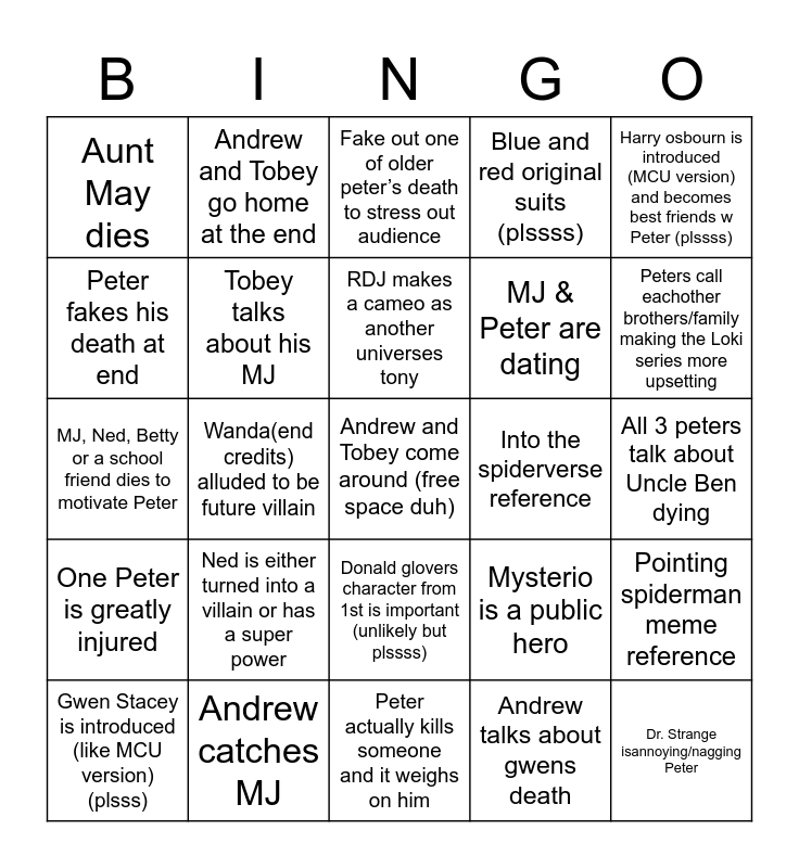 This bingo card has a free space and 24 words: Ned is either turned into a villain or has a super power, Andrew catches MJ, RDJ makes a cameo as another universes tony, Gwen Stacey is introduced (like MCU version) (plsss), Harry osbourn is introduced (MCU version) and becomes best friends w Peter (plssss), Aunt May dies, Peter fakes his death at end, Andrew and Tobey go home at the end, Into the spiderverse reference, Donald glovers character from 1st is important (unlikely but plssss), MJ & Peter are dating, MJ, Ned, Betty or a school friend dies to motivate Peter, Mysterio is a public hero, Pointing spiderman meme reference, Tobey talks about his MJ, Andrew talks about gwens death, All 3 peters talk about Uncle Ben dying, Fake out one of older peter’s death to stress out audience, Peters call eachother brothers/family making the Loki series more upsetting, Wanda(end credits) alluded to be future villain, Dr. Strange isannoying/nagging Peter, One Peter is greatly injured, Blue and red original suits (plssss) and Peter actually kills someone and it weighs on him.