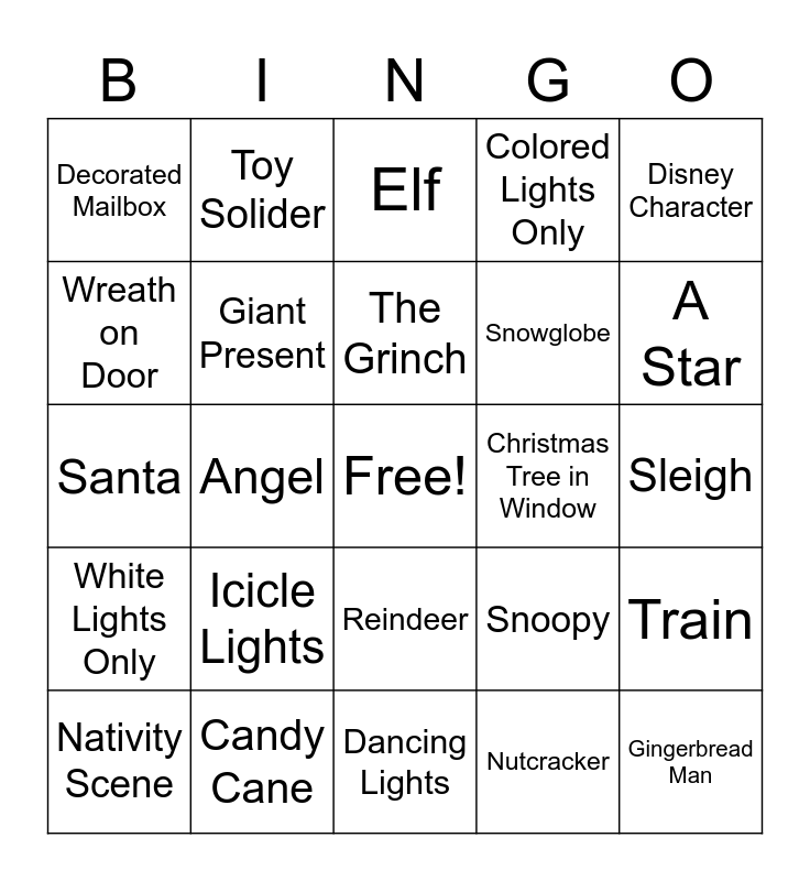 This bingo card has a free space and 25 words: Icicle Lights, Dancing Lights, The Grinch, Nativity Scene, Disney Character, Decorated Mailbox, Wreath on Door, Toy Solider, Christmas Tree in Window, Reindeer, Snowglobe, Santa, Snoopy, Train, Giant Present, Stocking, Sleigh, Elf, A Star, Angel, Gingerbread Man, Candy Cane, White Lights Only, Colored Lights Only and Nutcracker.